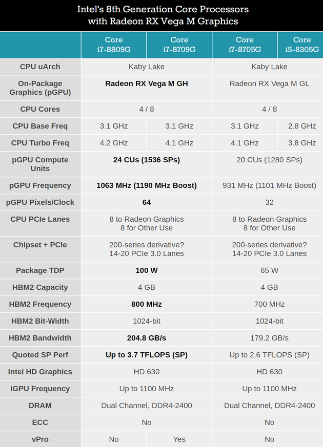 全新的第八代智能英特爾Core處理器共有兩個規(guī)格,分別是搭載Radeon RX Vega M GL顯卡的第八代Intel Core處理器(65W TDP)和搭載Radeon RX Vega M GH 顯卡的第八代Intel Core處理器(100W TDP),采用未鎖頻配置。