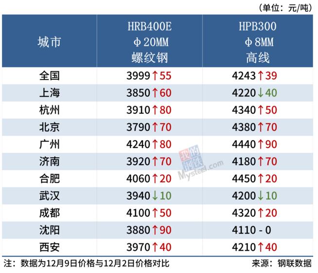 據Mysteel監(jiān)測,截至12月9日,全國主要城市20mm三級抗震螺紋鋼均價3999元/噸,周環(huán)比上漲55元/噸;8.0mmHPB300高線均價4243元/噸,周環(huán)比上漲39元/噸。