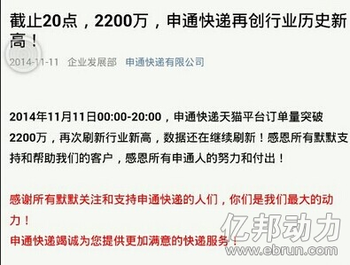 據(jù)億邦動(dòng)力網(wǎng)了解,來(lái)自天貓和淘寶的訂單占到了申通快遞的一大部分,而且申通快遞也是阿里菜鳥(niǎo)物流的合作方,在今年雙11促銷中是物流的主力軍之一。