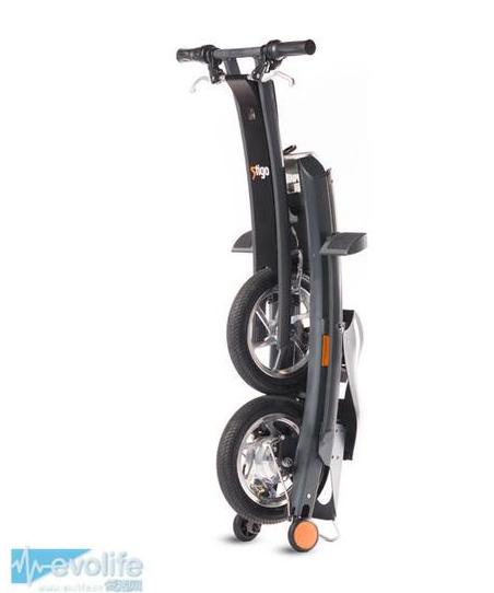 Stigo折疊電動(dòng)車的設(shè)計(jì)師通過(guò)獨(dú)特的joint-lock結(jié)構(gòu),讓Stigo可折疊為直立狀態(tài),配合尾端輔助輪,可隨身拖行,雖然有13.5kg的重量也不是不可以接受。當(dāng)該折疊電動(dòng)車處于直立狀態(tài)時(shí),其占地面積僅為45X40cm。