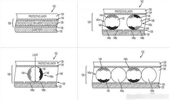 該文件還詳細(xì)描述了實(shí)現(xiàn)動(dòng)態(tài)可調(diào)節(jié)的電子墨水屏的各種方法和技術(shù),從顏料變化到圖形轉(zhuǎn)變?cè)俚嚼硐氩牧系倪x取等。此外,這一觸控條還提供了一種低功耗技術(shù),這是電子墨水顯示的獨(dú)特屬性之一。