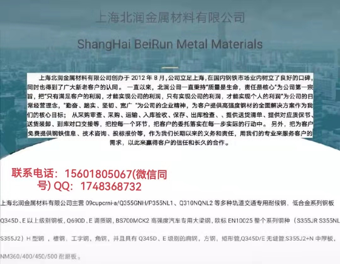 上海北潤(rùn)金屬材料有限公司創(chuàng)辦于2012年8月,是國(guó)內(nèi)一家為數(shù)不多的專業(yè)的高強(qiáng)度耐低溫材料的供應(yīng)公司,我司主營(yíng)Q355D/E/ND/NE/ME耐低溫卷板、開(kāi)平板、出廠平板、風(fēng)電鋼中厚板、圓鋼、工角槽H型鋼,NM400/450/500耐磨板,BS700MCK2高強(qiáng)板,歐標(biāo)低合金板S355J2、Q345B/D/E無(wú)縫管、冷拔方管。公司擁有2個(gè)室內(nèi)倉(cāng)庫(kù)分別為: