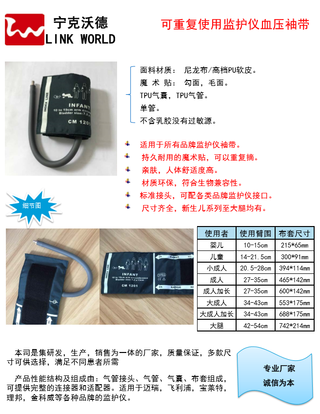 深圳市寧克沃德醫(yī)療器械有限公司始于2015年在深圳市成立 ,專業(yè)生產(chǎn)監(jiān)護(hù)儀血壓袖帶,理療電極片。是一家致力于發(fā)展中、高端醫(yī)療器械,集線束研發(fā),生產(chǎn),銷售于一體的企業(yè) 。擁有豐富的市場營銷經(jīng)驗(yàn)和雄厚的專業(yè)化生產(chǎn)能力,并為Philips,SCHILLER,Masimo等全球知名品牌分銷商。