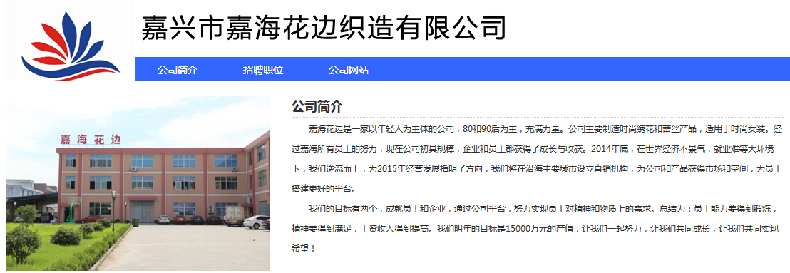 嘉興市嘉;ㄟ吙椩煊邢薰荆ɡ俳z莉花邊)2005年底成立,是花邊行業(yè)的一家專業(yè)性公司,專研于以下花邊類產(chǎn)品的生產(chǎn)銷售和服務(wù):