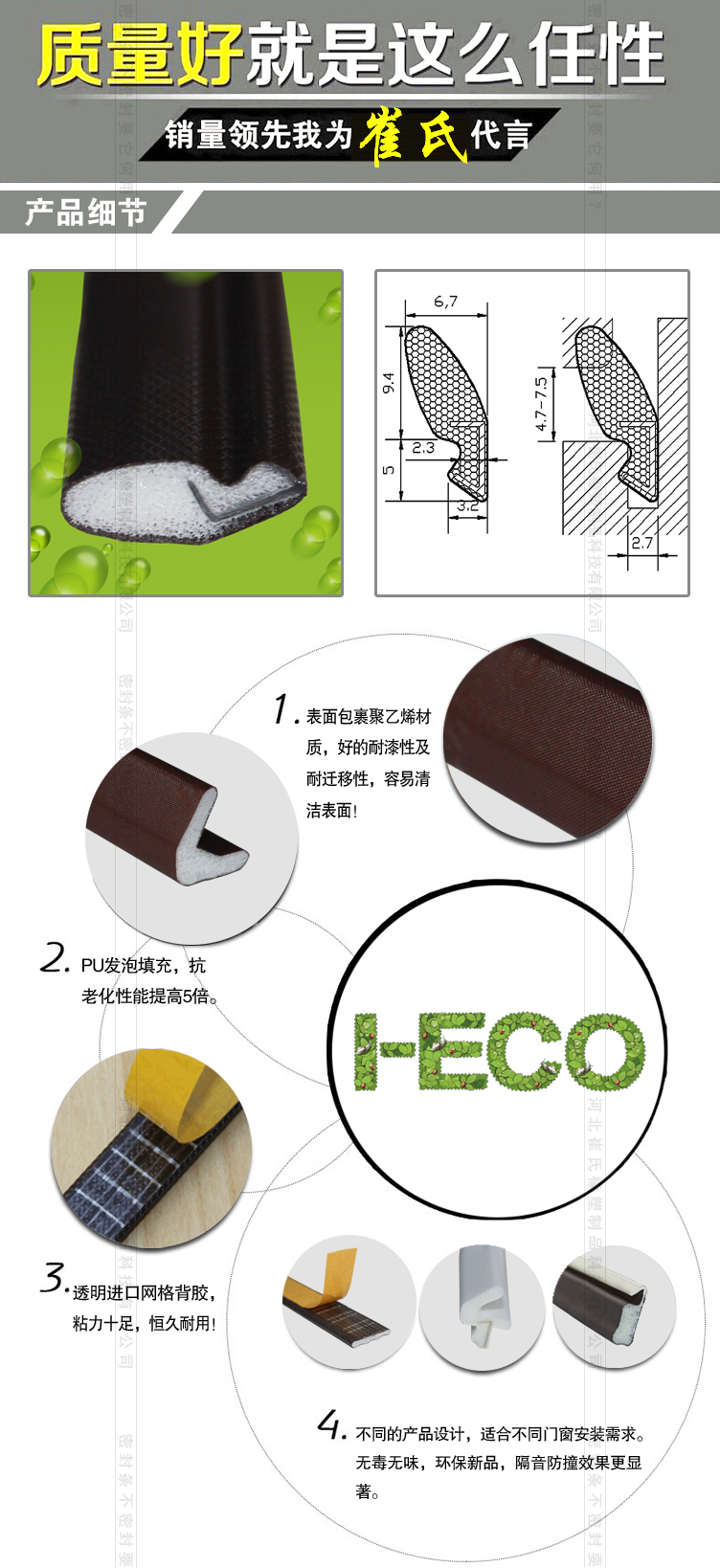 隔熱防寒,防風(fēng)塵及爬蟲,外觀高檔,耐老化 防紫外線 防水不變形 產(chǎn)品質(zhì)保10年 深得國內(nèi)高端門窗廠家認(rèn)可,是目前國內(nèi)最高端的新一代門窗密封條產(chǎn)品