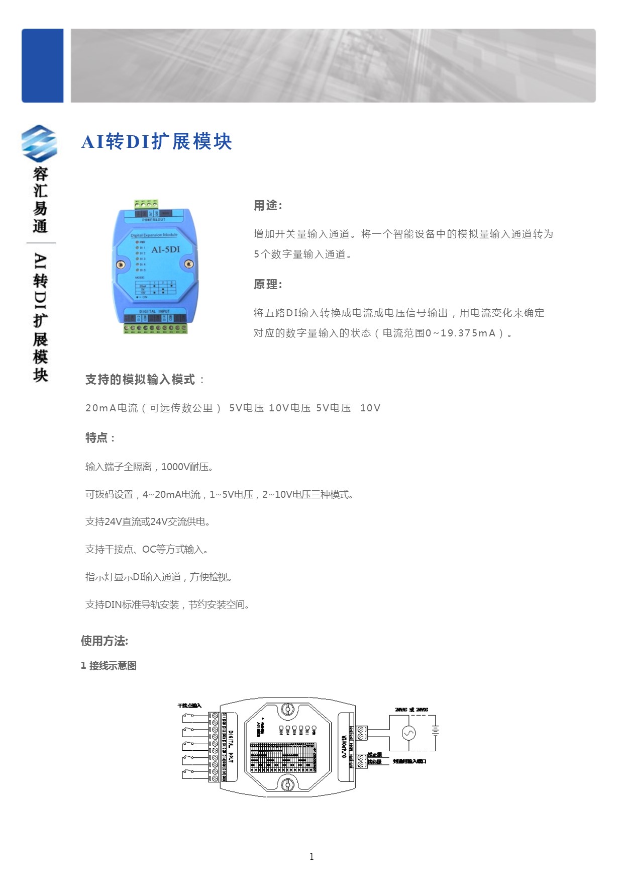 用途: 增加開關(guān)量輸入通道。將一個智能設(shè)備中的模擬量輸入通道轉(zhuǎn)為5個數(shù)字量輸入通道。
