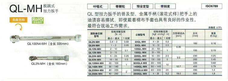 品牌tohnichi/東日型號(hào)ql100n4-mh ,900ql4-mh扳手外形單頭扳手扳手頭類型固定棘輪頭制式公制驅(qū)動(dòng)方頭尺寸(inch)1/2刻度顯示方式視窗顯示刻度最小扭矩20(n.m)最大扭矩100(n.m)材質(zhì)其他表面處理其他特性金屬手柄分度值1(n.m)精度±3%全長(zhǎng)335(mm)重量690(g)加工定制否規(guī)格ql100n4-mh(20-100n.m),900ql4-mh(200-1000kgf