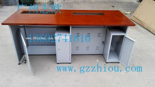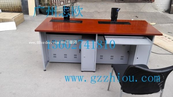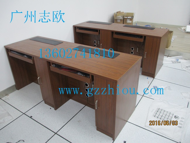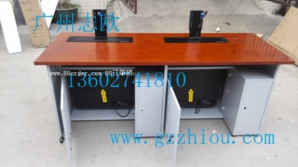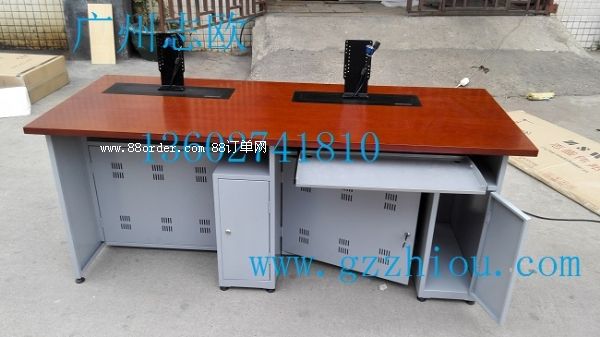 結(jié) 構(gòu):每張桌子配置2臺(tái)電動(dòng)遙控液晶升降機(jī)(當(dāng)時(shí)電腦時(shí)液晶顯示器自動(dòng)重桌底升起且顯示器自動(dòng)通電,當(dāng)不使用顯示器時(shí),顯示器自動(dòng)隱藏于桌底),每一個(gè)位置都有一個(gè)電腦主機(jī)位,電腦桌前面設(shè)有檢修門,方便線路維修。