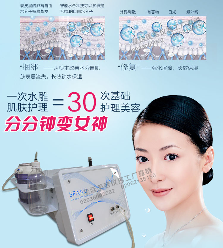 美膚spa水雕儀徹底改變了傳統(tǒng)式個人手工技巧清潔皮膚的做法,利用全智能程序控制的真空負壓模式,通過產(chǎn)品和設(shè)備的完美結(jié)合,在短時間內(nèi)深度清潔表皮和毛孔內(nèi)的脫落角質(zhì)、粉刺、黑頭及其他污垢。同時提升產(chǎn)品的營養(yǎng)成份深層吸收,促使毛孔收細、平滑肌膚、增加皮膚的保濕性,更能使肌膚呈現(xiàn)水嫩凈白,水潤飽滿的質(zhì)感。