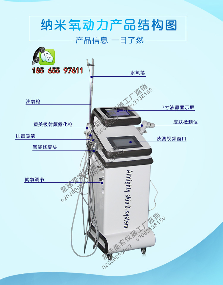 利用強壓氧氣和水以微小的水滴以噴霧流形式作用于皮膚,可以穿透皮膚毛孔及皮膚裂紋,由表皮層直至滲透到真皮層從而促進細胞的再生,快速、直接為肌膚提供充足營養(yǎng),同時清除較深的表皮層垃圾,高壓氧和營養(yǎng)液可刺激真皮層的纖維組織再生,促使細胞的新陳代謝。從而達到有效祛除皮膚亞黃、灰暗、黃褐斑、嫩膚、除皺的效果。