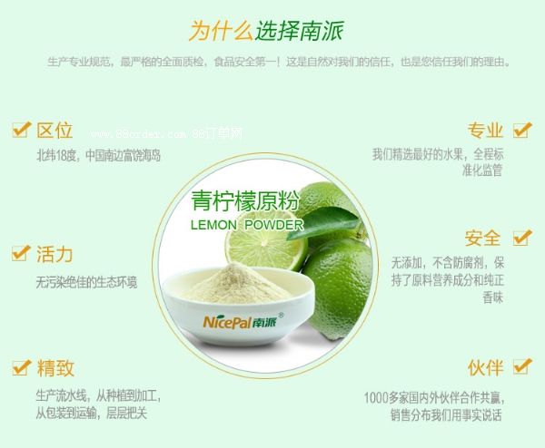 南派青檸檬原粉選用海南島獨(dú)特的青檸檬鮮果肉榨漿,經(jīng)世界先進(jìn)的噴霧干燥工藝技術(shù)加工制成,有效保持了新鮮檸檬的營(yíng)養(yǎng)成份和香味,即時(shí)溶解,使用方便。