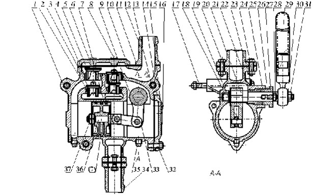 S、SH-25、38型手搖泵的結(jié)構(gòu)原理是,當(dāng)用手往復(fù)搖動搖手柄(29)時,通過軸(21)、搖臂(9)、連桿(36)等傳動機(jī)構(gòu),使活塞(7)作往復(fù)運(yùn)動。如圖所示,當(dāng)活塞向左移動時,右端的泵缸體積逐漸擴(kuò)大,形成真空,液體從吸水管(34)經(jīng)過鑄在泵體旁邊的吸入流道頂開吸水閥進(jìn)入缸體右端。在同一時間里,缸體左側(cè)由于活塞的壓縮,使壓水閥(5)頂開,液體經(jīng)吐出管(11)排出。若活塞的運(yùn)動方向返回向右時,則泵缸左側(cè)吸入液體,泵缸右側(cè)排出液體,這樣往復(fù)不歇地把液體吸入排出。形成泵的工作。泵的壓水閥向上行程由蓋板(6)限止,吸水閥向上行程由壓水閥限止。蓋板與泵體用螺栓(8)緊固,活塞行程由泵蓋(14)和泵體限止。