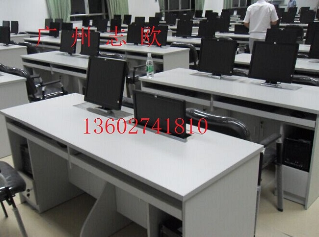 結(jié) 構(gòu):每張桌子配置2臺電動遙控液晶升降機(當時電腦時液晶顯示器自動重桌底升起且顯示器自動通電,當不使用顯示器時,顯示器自動隱藏于桌底),每一個位置都有一個電腦主機位,電腦桌前面設(shè)有檢修門,方便線路維修。