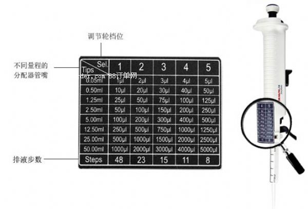 - 7種不同規(guī)格的聚丙烯分配器管嘴可供選擇,量程從0.5ml到50ml