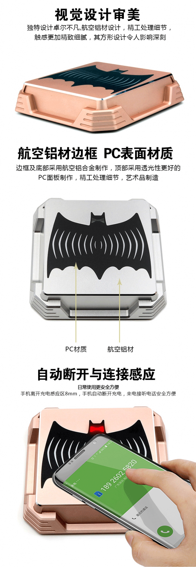 全鋁材成型,三線圈感應(yīng),充電速度快,外觀霸氣,方便實(shí)用,適合在辦公室和固定場所使用。