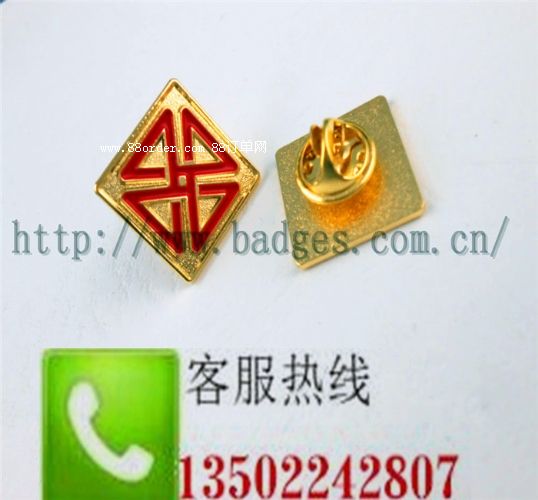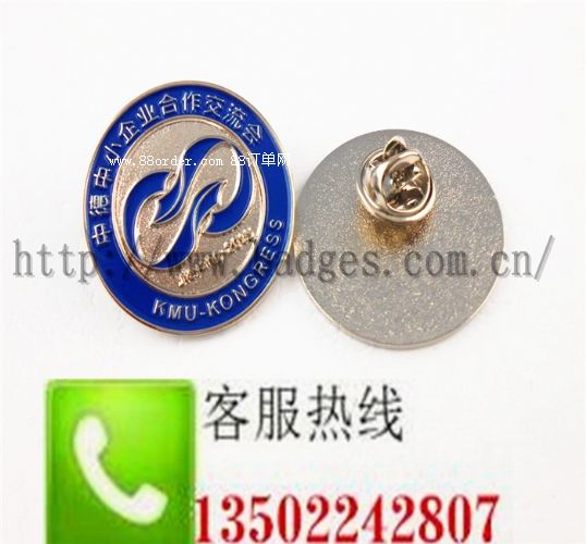 徽章.此產(chǎn)品材質(zhì)一般為青銅、鐵、鋅合金、鋁片等,工藝有蝕刻、沖壓,合金壓鑄等,表面上色效果有烤漆、軟琺瑯等。電鍍效果有鍍金、鍍鎳、鍍雅鎳、鍍黑鎳、鍍霧金等。配件一般用安全別針或蝴蝶帽,也有客戶選擇高級卡帽和橡膠帽。普通膠袋包裝、打樣時間7-8天,做貨時間8-10天。