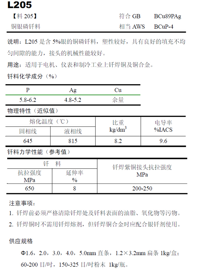 說(shuō)明:料205低銀釬料含銀量為5%,熔點(diǎn)為645-815℃,具有良好的流動(dòng)性和填縫性、釬縫表面光潔、接頭強(qiáng)度高、耐沖擊。