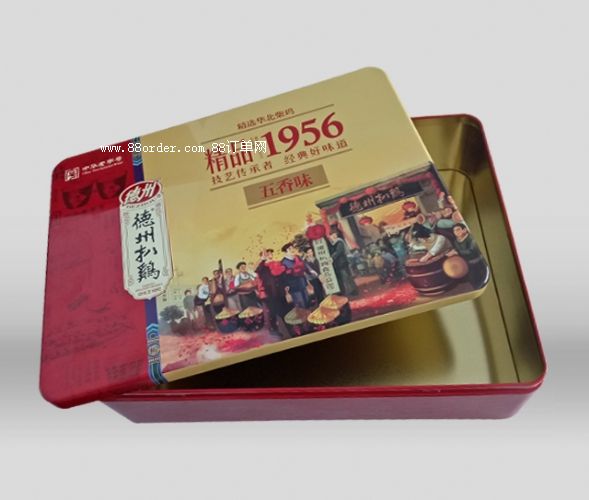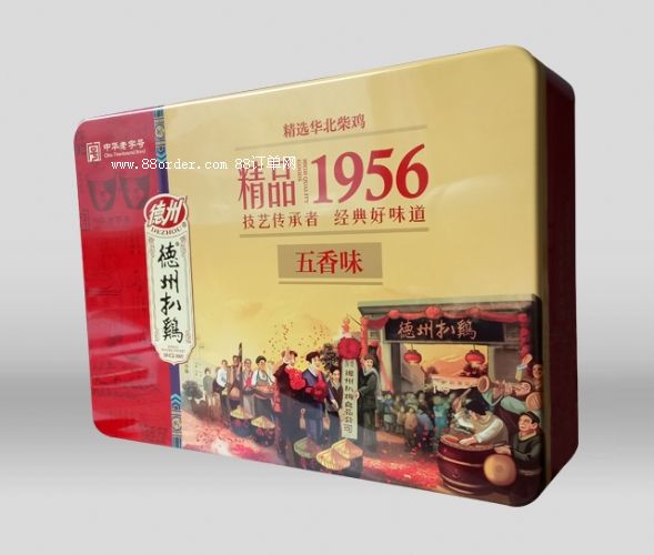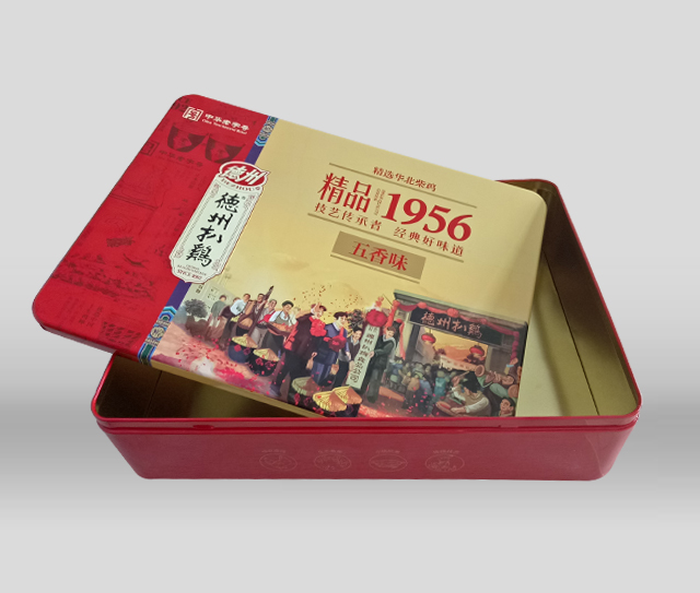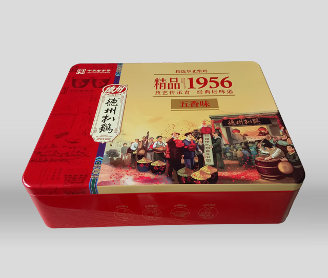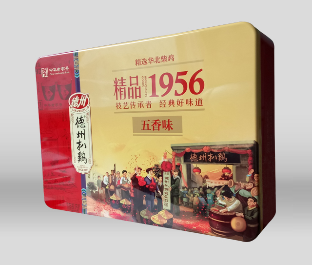 潤(rùn)豐包裝以至于德州扒雞合作為其生產(chǎn)包裝盒,這款精品扒雞鐵盒包裝是2017年最新生產(chǎn)的禮品包裝盒,盒蓋采用天地蓋盒型,盒蓋上的圖案選擇扒雞公司成立時(shí)人們熱烈慶祝的場(chǎng)面,既喜慶有有代表意義,又能體現(xiàn)德州扒雞的悠久歷史,包裝盒顏色選用紅黃為主色調(diào),既大氣又上檔次,是一款成功的鐵盒包裝。