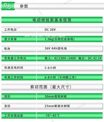 本產(chǎn)品為電池驅(qū)動電動修枝剪,由固定刀片、移動刀片、鋰電池、充電器、連接線、工作包、工具箱等部分組成,充電電壓為ac 110v~240v,主要應(yīng)用于30mm以下果枝嫁接的剪切和修剪及大批果園修剪、收摘等。使用時簡捷方便,可調(diào)整開口大小,是傳統(tǒng)手工剪枝效率的8-10倍,修枝質(zhì)量明顯高于傳統(tǒng)手工剪刀。