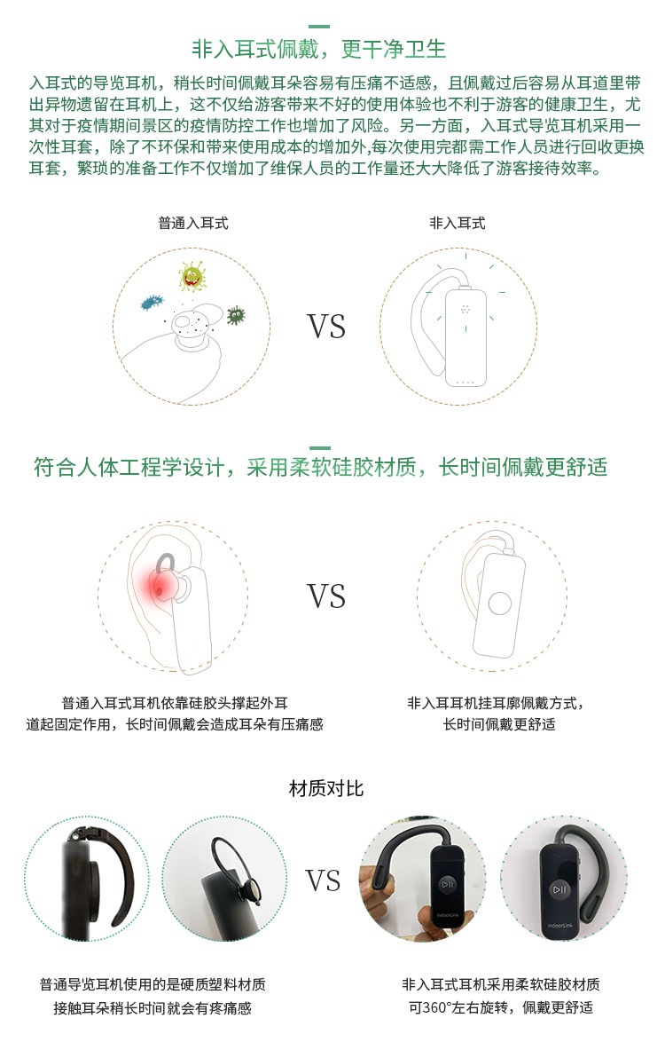 市面上大多數(shù)普通導游器采用的是傳統(tǒng)的入耳式設計,稍長時間佩戴不僅使耳朵容易有壓痛不適感,且佩戴過后容易從耳道里帶出異物遺留在耳機上。這不僅給游客帶來不好的使用體驗也不利于游客的健康衛(wèi)生,尤其對于疫情期間景區(qū)的疫情防控工作也增加了風險。