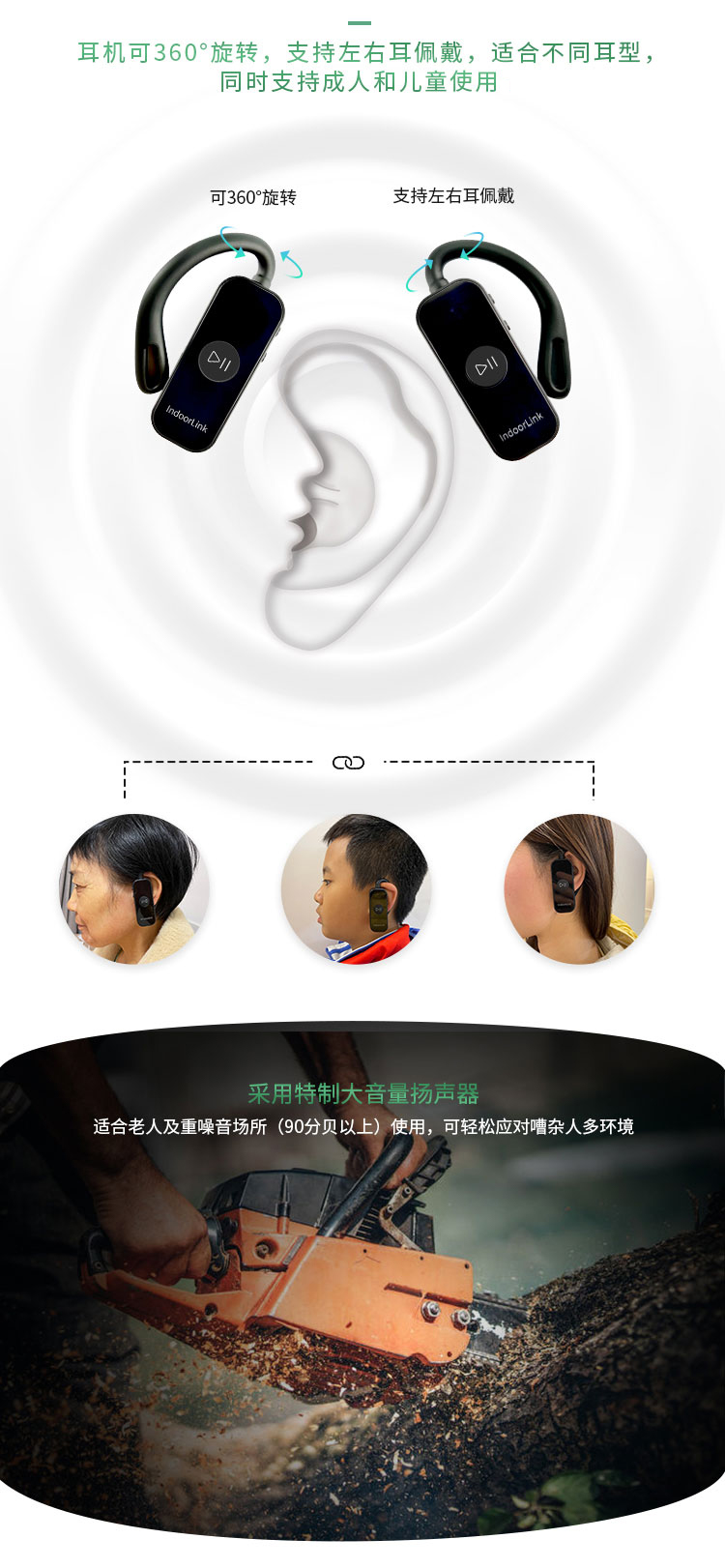 在外觀上,深層互聯(lián)耳掛式電子導游器沒有沿襲傳統(tǒng)耳掛式電子導游器常用的入耳式設計,而是采用了非入耳式設計。此設計是依據(jù)人體工程學,并從用戶體驗角度出發(fā)采用了柔軟硅膠材料,耳機可以360°旋轉(zhuǎn),支持左右耳佩戴,適合不同人群、不同耳型佩戴,且佩戴更舒適、更干凈衛(wèi)生。