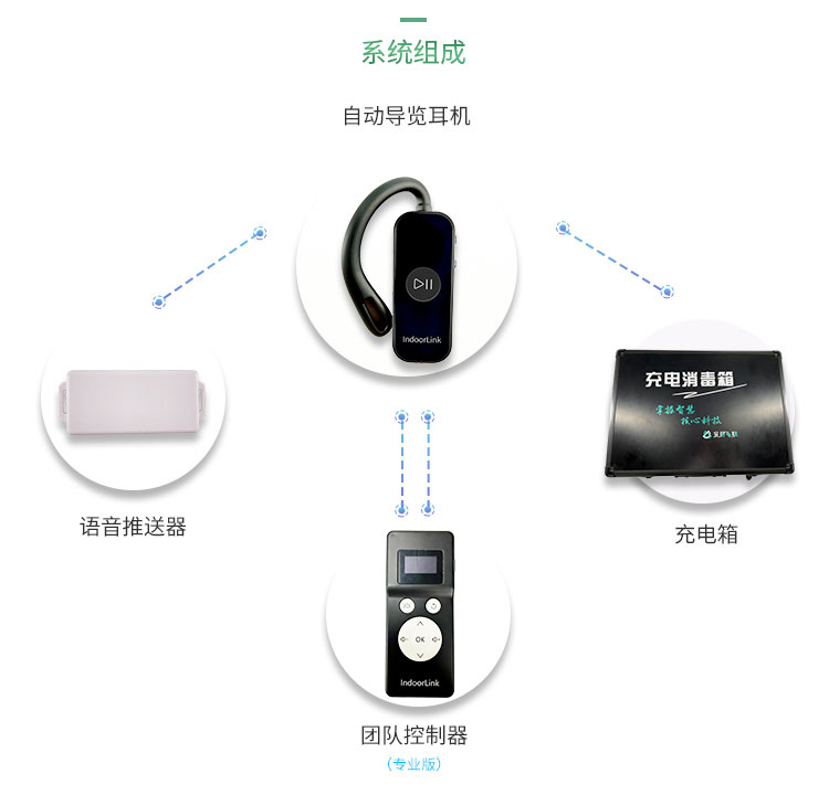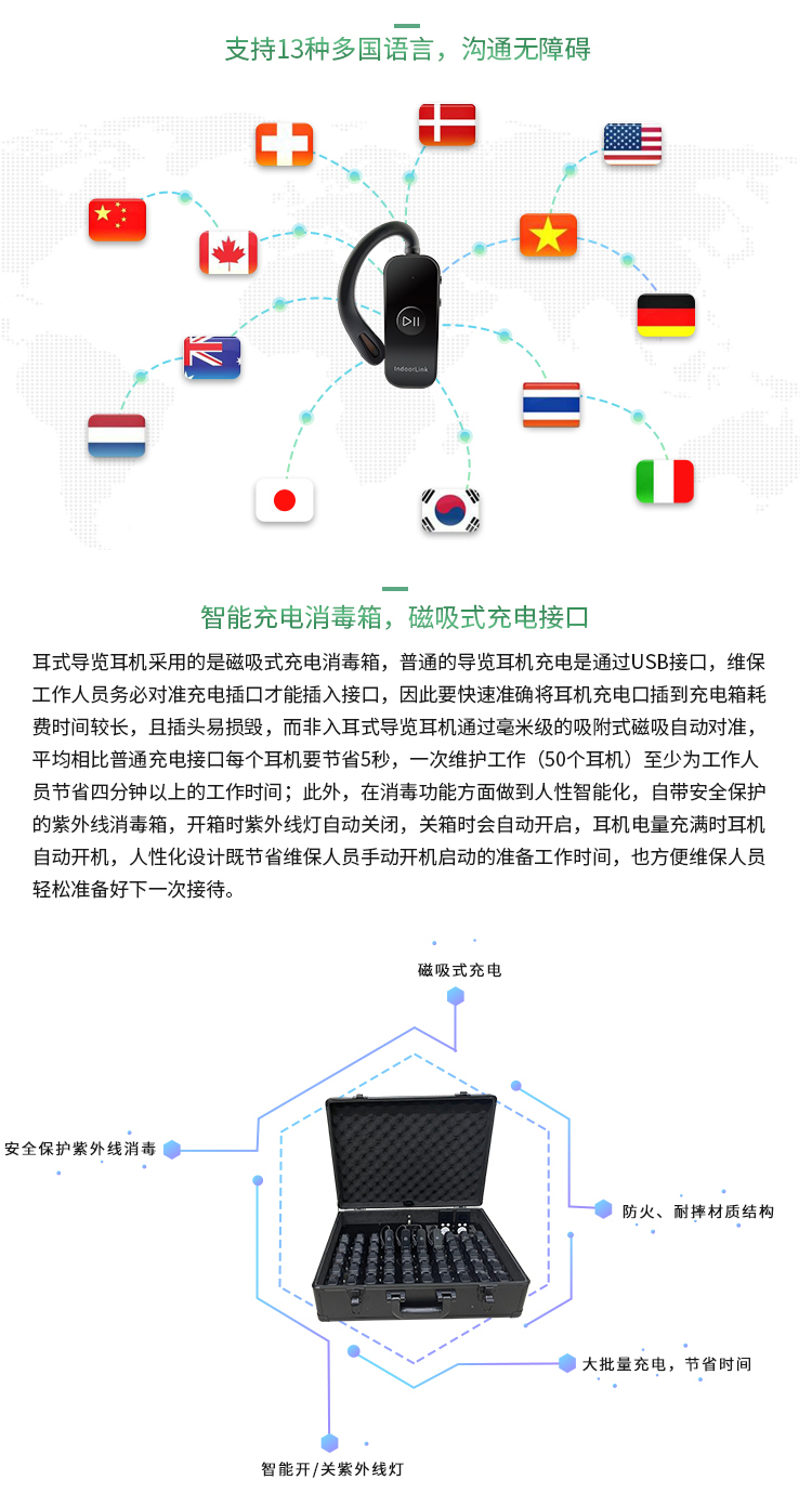 深層互聯(lián)耳掛式電子導游器充電接口采用的是磁吸式接口,通過毫米級的吸附式磁吸自動對準,平均相比普通充電接口每個耳機要節(jié)省5秒,一次維護工作(50個耳機)至少節(jié)省四分鐘以上的工作時間;此外,在消毒功能方面做到人性智能化,自帶安全保護的紫外線消毒箱,開箱時紫外線燈自動關閉,關箱時會自動開啟,耳機電量充滿時耳機自動開機,人性化設計既節(jié)省維保人員手動開機啟動的準備工作時間,也方便維保人員輕松準備好下一次接待。