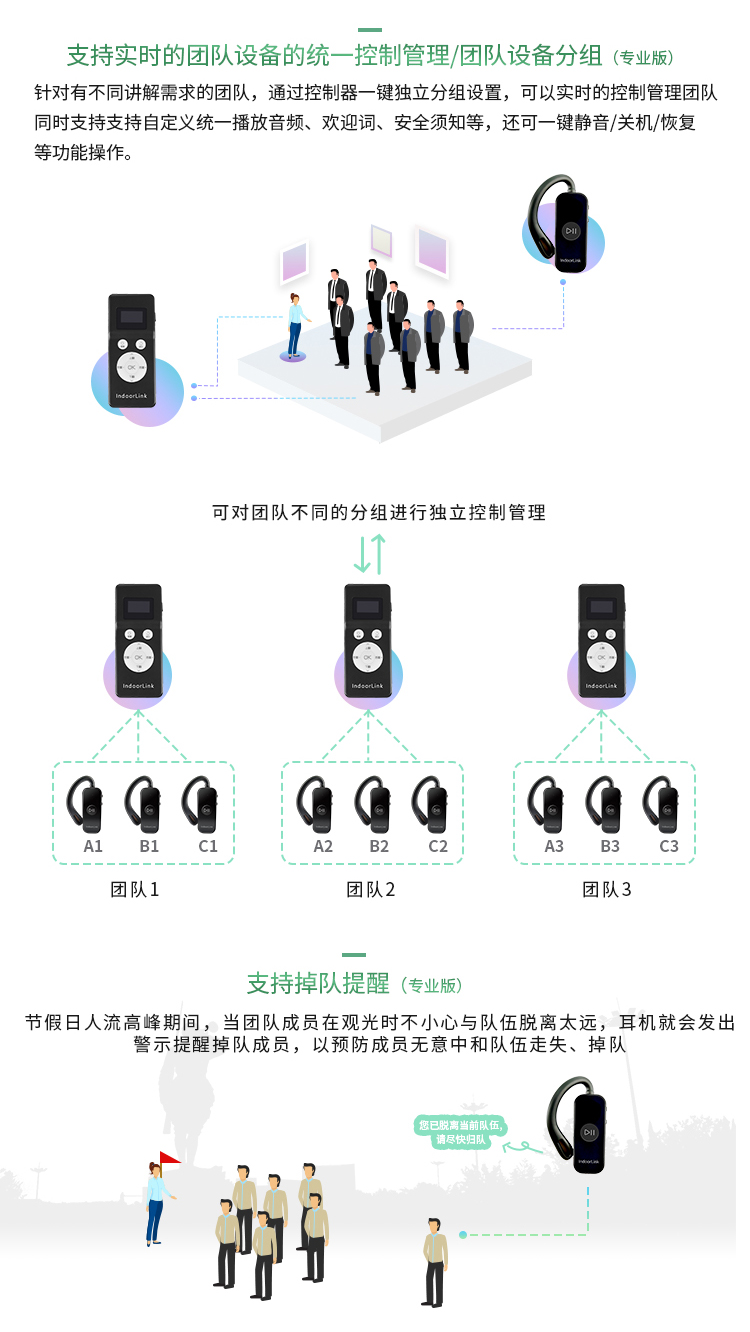 首次引進了團隊分組功能,和普通導游器的團隊分組功能不同的是,不需要通過電腦進行設置,講解員手握輕巧的控制器就可以針對有不同講解需求的團隊進行不同的獨立分組設置,進行實時的團隊設備一鍵統(tǒng)一控制管理工作,同時支持自定義統(tǒng)一播放音頻、歡迎詞、安全須知等,還可一鍵靜音/關機/恢復等功能操作。