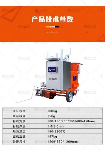 7.凈重:110kg 同時(shí),我公司還有相關(guān)配套設(shè)備,比如說(shuō)熱熔釜,如果劃線量比較大的話,要配套使用,另外還有熱熔舊線的除線機(jī),可以去除舊的熱熔標(biāo)線。