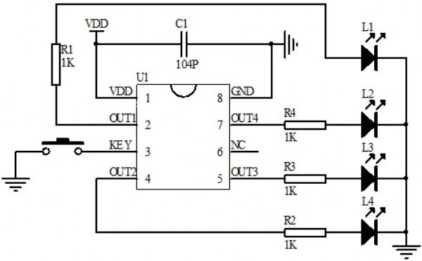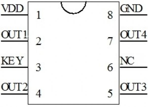 短按開機(jī)長按3秒關(guān)機(jī),芯片供電方式:dc5v-8.4v,通過ldo降壓至3.3v給芯片供電。一個輸入開關(guān)對地觸發(fā)控制,四路輸出。