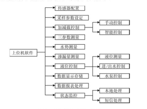 上位機軟件模塊組成如圖所示,其主要功能包括采樣參數(shù)設定、手動調(diào)試控制、傳感器配置、溫度/含水率/電導率測量、水勢測量、滲漏量測量、蒸散發(fā)量測量、地表徑流測量、液位測量、排水電磁閥控制、水泵控制、數(shù)據(jù)顯示存儲、狀態(tài)監(jiān)控、故障記錄及報表處理等。數(shù)據(jù)記錄間隔范圍5min,10min,15min,30min,1h,4h, 8h,12h,24h等,可根據(jù)需要進行選擇,測量時間以上位機時間為準。