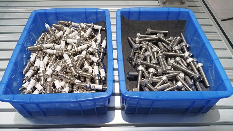 火花塞和螺釘無序的擺放在料框里,通過人工包裝挑選,根據(jù)工件正反面確認(rèn)是否需要翻轉(zhuǎn),完全靠人工,工人勞動強(qiáng)度大,成本高,因此需要進(jìn)行自動化改造。