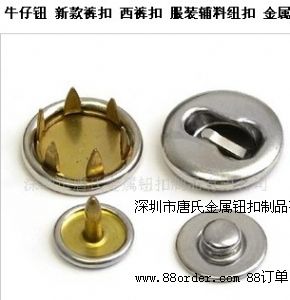 唐氏金屬鈕扣廠是一家品牌老廠,從最早2002年成立至今,在五金鈕扣領(lǐng)域經(jīng)歷了十多年年的摸打滾爬,歷經(jīng)無(wú)數(shù)風(fēng)風(fēng)雨雨,但唐氏人從來(lái)沒(méi)有改變過(guò)對(duì)品質(zhì)的執(zhí)著!唐氏ts品牌五爪扣,選料上乘,做工精細(xì),款式繁多,質(zhì)優(yōu)價(jià)廉! 本廠專業(yè)生產(chǎn)各種五爪扣,如:銅五爪扣/珠光面五爪扣/刻字五爪扣/刻花五爪扣/帶鉆五爪扣/空心五爪扣/噴漆五爪扣/電鍍五爪扣/平面五爪扣/平面空心五爪扣/7.5mm/9.5mm/11mm/13mm/15mm/17mm/20mm/21mm等等60多個(gè)款式供客戶選擇,應(yīng)有盡有。 唐氏金屬鈕扣廠家六大產(chǎn)品詳細(xì): 1.四合扣:60個(gè)款式金屬四合扣,急鈕,按扣,手鐲專用扣,首飾扣面.手環(huán)裝飾按鈕. 2.五爪鈕:111#-999.5# 80多個(gè)規(guī)格圈面爪鈕,加長(zhǎng)爪托,霖面/包面爪鈕;珠面爪鈕. 3.啪鈕:20個(gè)款式滴膠啪鈕,四方啪鈕,飛碟款啪鈕,歐美款啪鈕,車輪款啪鈕. 4.時(shí)裝鈕:30個(gè)款式皇宮款時(shí)裝鈕,蘑菇型時(shí)裝鈕,球形時(shí)裝鈕,噴油/鍍金色時(shí)裝鈕. 5.水泡鈕:10個(gè)款式恭候客戶選擇,各種鈕面應(yīng)有盡有,各種力度任客選擇. 6.西褲扣:70個(gè)款式西褲扣,包面褲扣,勾扣,電鍍褲扣,鍍金色西褲扣,噴油褲前扣