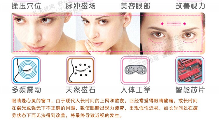 ☆.每天使用眼部按摩儀可有效預(yù)防眼睛近視,清除眼袋、皺紋、黑眼圈,增強(qiáng)皮膚彈性。