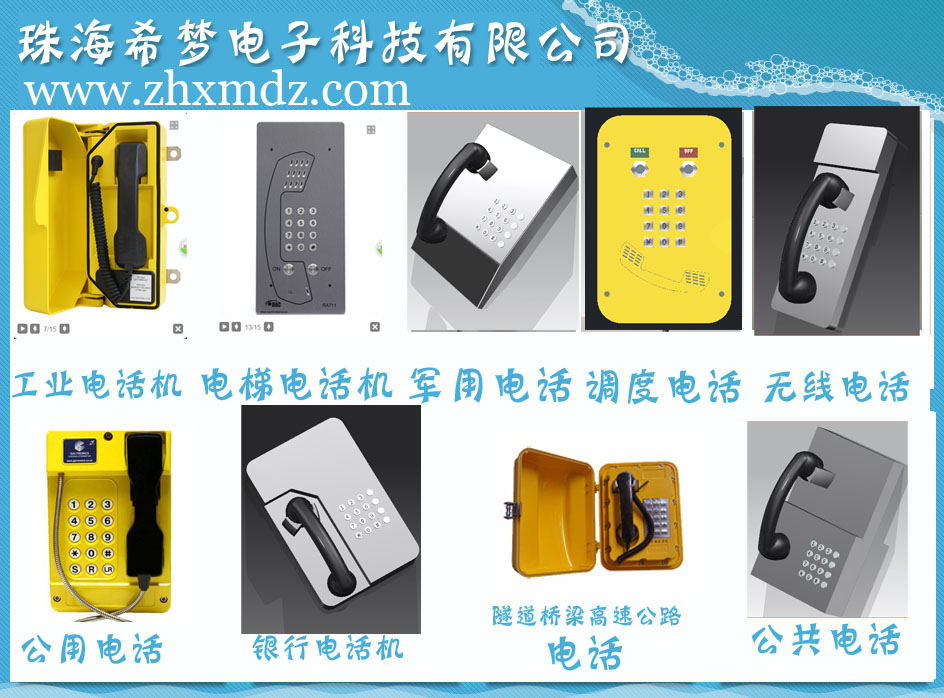 專業(yè)生產研發(fā)銀行電話機,工業(yè)電話機,投幣插卡電話機,特種電話機,地鐵隧道電話機,防爆電話機,電梯電話機,防水電話機,調度電話機等,及電話機配件