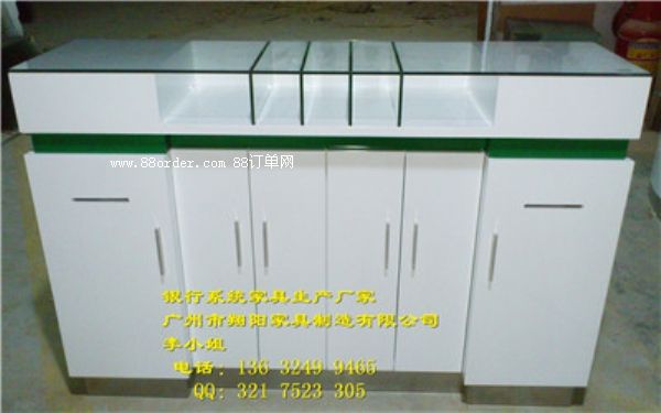 材質(zhì):8mm鋼化玻璃臺面,白色烤漆臺身,信合藍裝飾邊,白色烤漆免漆板內(nèi)柜,拉絲不銹鋼底座,可按要求定做。
