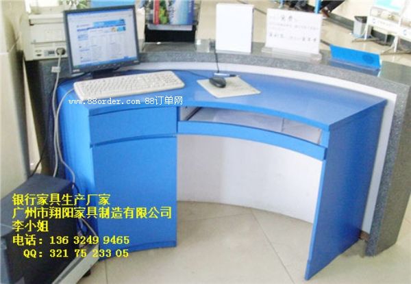材質(zhì):黑色人造石臺面,白色烤漆臺身,黑色烤漆底座,建行藍色防火板內(nèi)輔臺。