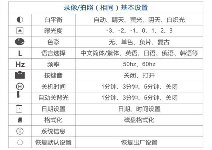 4. 菜單設(shè)置:白平衡:自動(dòng)、晴天、熒光、陰天、白熾光,曝光度:-3,-2,-1,0,1