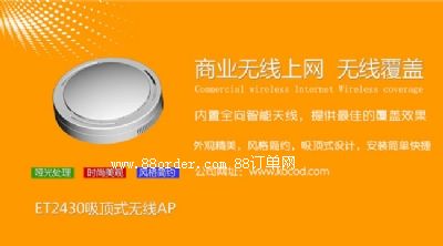 et2430大功率吸頂式無線ap,性能穩(wěn)定,信號(hào)覆蓋范圍廣,施工簡(jiǎn)單快捷,美觀大方,對(duì)新裝酒店與改造酒店都很方便,不需要對(duì)客房原有線路做任何改變。造價(jià)成本低,目前是賓館出租屋、工廠宿舍常用的無線覆蓋方案。
