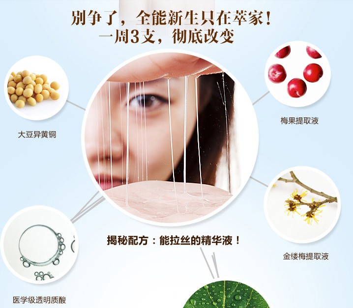 采用高壓提取技術(shù)hp提取高濃度的蝸牛分泌物,搭配植物提取物,卵磷脂萃取精華,快速提升肌膚的水潤度