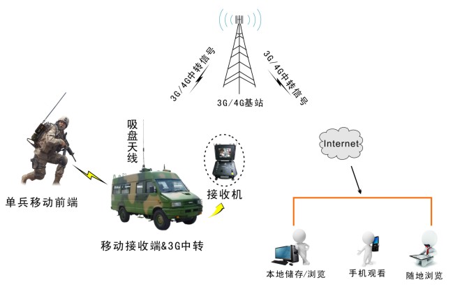 前端單兵如偵察員、消防人員、搜救人員或電視采訪人員等,采用小型化、背負(fù)式、扣版式發(fā)射機(jī),將戰(zhàn)場(chǎng)、受災(zāi)現(xiàn)場(chǎng)的實(shí)況信號(hào)實(shí)時(shí)傳輸?shù)胶蠓降闹笓]車。后端指揮車通過(guò)接收機(jī)將接收到的圖像在監(jiān)視器上顯示,便于實(shí)時(shí)了解現(xiàn)場(chǎng)的情況,便于及時(shí)指揮。