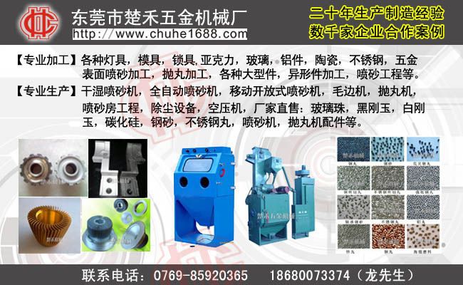 東莞市楚禾五金機械廠創(chuàng)建于2000年,是專業(yè)從事噴砂處理設(shè)備與拋丸機等涂裝設(shè)備的研究、設(shè)計、制造及商貿(mào)為一體的科技型實體企業(yè)。企業(yè)設(shè)立技術(shù)研發(fā)部、生產(chǎn)制造部、營業(yè)部及售后服務(wù)部。在新老客戶的支持和幫助下,企業(yè)經(jīng)過多年的努力,得到了長足的發(fā)展壯大,銷售業(yè)績連年遞增。企業(yè)憑借自身雄厚的技術(shù)力量和生產(chǎn)能力不斷地改進更新國內(nèi)外先進技術(shù)和產(chǎn)品,制造出具國際領(lǐng)先水平的表面處理楚禾牌噴砂機,拋丸機系列產(chǎn)品。主要產(chǎn)品:一、 噴砂機:標準型密閉噴砂機、臺車轉(zhuǎn)盤密閉噴砂機、滾筒式噴砂機、壓力密閉式噴砂機、開放式噴砂機、濕式噴砂機、輸送式噴砂機、環(huán)帶式噴砂機、連續(xù)輸送式自動噴砂機、回轉(zhuǎn)式圓盤自動噴砂機、各式工業(yè)用集塵機、拋丸清理設(shè)備拋光、磨光設(shè)備、涂裝設(shè)備、環(huán)保除塵設(shè)備等系列逾百種產(chǎn)品。二、拋丸機:履帶式拋丸機,吊鉤式拋丸機,滾筒式拋丸機,軌道通過式拋丸機,懸鏈式拋丸機,轉(zhuǎn)臺式拋丸機;三、毛邊機:冷凍毛邊機,立式彈丸噴射式冷凍修邊機,臥式滾珠式冷凍修邊機等。四、噴砂房:噴砂房設(shè)計、噴砂房制作、噴砂房改造等 。五、代客加工:噴沙加工、拋丸加工、毛邊加工等。熱忱歡迎社會各界同仁蒞臨企業(yè)考察指導(dǎo)!