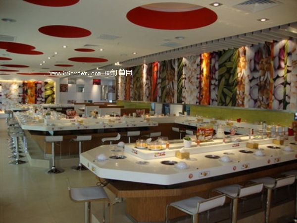然后輸送帶就會帶著食材圍繞店鋪的座位循環(huán)回轉(zhuǎn)。工作人員站在原地就可以隨時補充新鮮的食材,而不用到處跑動,最大限度的減縮了人力資源成本的損耗。而消費者也不用再看哪些枯燥無味的菜單,