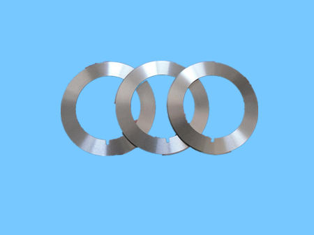 分切刀片主要用于紙張、膠帶、磁帶、薄膜、金、銀、 銅、鋁、汰合金箔等物品的縱切和橫切。這些高檔的金屬箔材的分切要 求精度高,無毛刺、無壓痕現(xiàn)象,所以分切的難度較大,那么對(duì) 縱切、橫切的刀具精度要求較高,切斷阻力最小,耐磨性最大, 刃口鋒利持久。針對(duì)這一難題,我公司引進(jìn)了國(guó)際上最先進(jìn)的數(shù) 控磨床,井聘請(qǐng)刀具技術(shù)專家,經(jīng)過了長(zhǎng)期研究開發(fā)替代進(jìn)口高 精度微米級(jí)縱切刀片。井應(yīng)用了高科技技術(shù),將刀片進(jìn)行陶瓷復(fù) 合及刀片表面碳化鎢鍍層處理、這樣刀片在分切時(shí),不易磨損而 且也不帖粉沫,減少了分切時(shí)的摩擦力,解決了這一難題,大大 提高了分切精度和速度,井延長(zhǎng)了刀具的使用壽命。