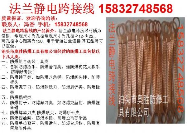 泊頭市奧勝防爆工具有限公司主營供應(yīng)勝防牌青海ex-asfjdljp法蘭靜電連接片,防爆組合工具,防爆工具,防爆人體靜電釋放器,防靜電產(chǎn)品,中石油石化專用工具,天然氣工具,油庫加油站專用工具,棧橋組合工具,配電室工具,電工工具,計(jì)量工具,堵漏組合,檢維修工具,維修專用工具及各種防爆組合專用工具,也可按客戶需求定做。