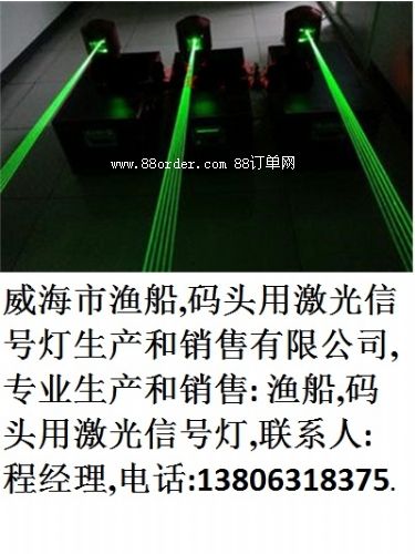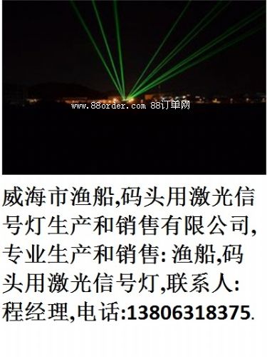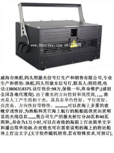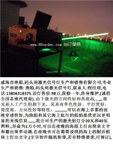 威海漁船市,船舶,碼頭用激光信號燈生產(chǎn)和銷售有限公司,專業(yè)生產(chǎn)和銷售: 漁船,船舶,碼頭用激光信號燈,聯(lián)系人:程經(jīng)理,.該燈售價:98萬,保修一年,終身維護,(誠招全國各地代理商)., ,, 由于激光的方向性好和亮度高, , ,,, 激光是人工產(chǎn)生的相干光,其具有單色性好、平行度好、亮度高、方向性好等特性,,,,,,,,,,,,可以在海上多霧的夜晚穿透性好,為漁船和其它海上航行的船舶提供更遠更明顯的光線信息.,,,,,,我公司生產(chǎn)的激光射燈分20瓦和40瓦兩種,,壽命為1萬小時,可以在夜晚的海面上打出簡單文字和播出簡單動畫.在夜晚也可在需要說明的海上的附近船體上打出文字,(文字軟件隨機附帶,若有特殊要求,可預訂),,,,,,,,,, ,,,,, 該激光燈分20瓦和40瓦兩種,,,,,,,40瓦的激光信號燈,,霧稀的夜晚該激光燈能打出約十五,六公理遠.20瓦的激光信號燈能打七,八公里,,,,,,,,,,,濃霧天夜晚40瓦的激光燈也能打出六,七公理遠,20瓦的四,五公里遠.,,,,,,為海上航行和作業(yè)的安全,提供了保障,,,,,,,,,,,,,,, 漁港碼頭管理站建筑樓頂裝備該激光指示燈,可在夜晚正確引導船只進出港.,漁港碼頭管理建筑樓頂一般裝40瓦功率的激光指示燈.,,,,也用在海岸線制高點和危險航道指示用.,,也用在海巡部門治安光線信號警示用., ,,,,,大型船舶用40瓦的,,小型船舶用20瓦.,,,,,,,光線顏色為綠色,,,,,,售價:40瓦型:98萬..,,,20瓦型:68萬,上門安裝培訓,保修一年.終身維護.,,, ,,,, 威海市漁船,船舶,碼頭用激光信號燈的性能和參數(shù):