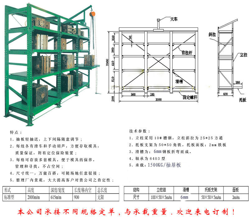規(guī)格:l3100*d600*h2000mm(3格*4層=12抽板) 無限長,承重:800-1000kg/每抽屜板,整體承重可達到9.6-12t 材質(zhì):立柱采用10#槽鋼;拉桿采為40*40方通;抽板底架采用50*50角鐵;面板為厚2.5mm鋼板;滑槽采用4mm鋼板折槽;軸承采用進口6404型 拉出:抽屜板可拉出65% 顏色:環(huán)保綠(默認) 備注:標準承重型模具架長度不是只能做到3100mm,只是一般做成3格(l3100mm)為一組模具架,實際使用中可以做到任意長度,這個過程勿需加多人工、材料或是工藝,只是簡單的把做好的立柱一個接一個的排列連接起來即可。