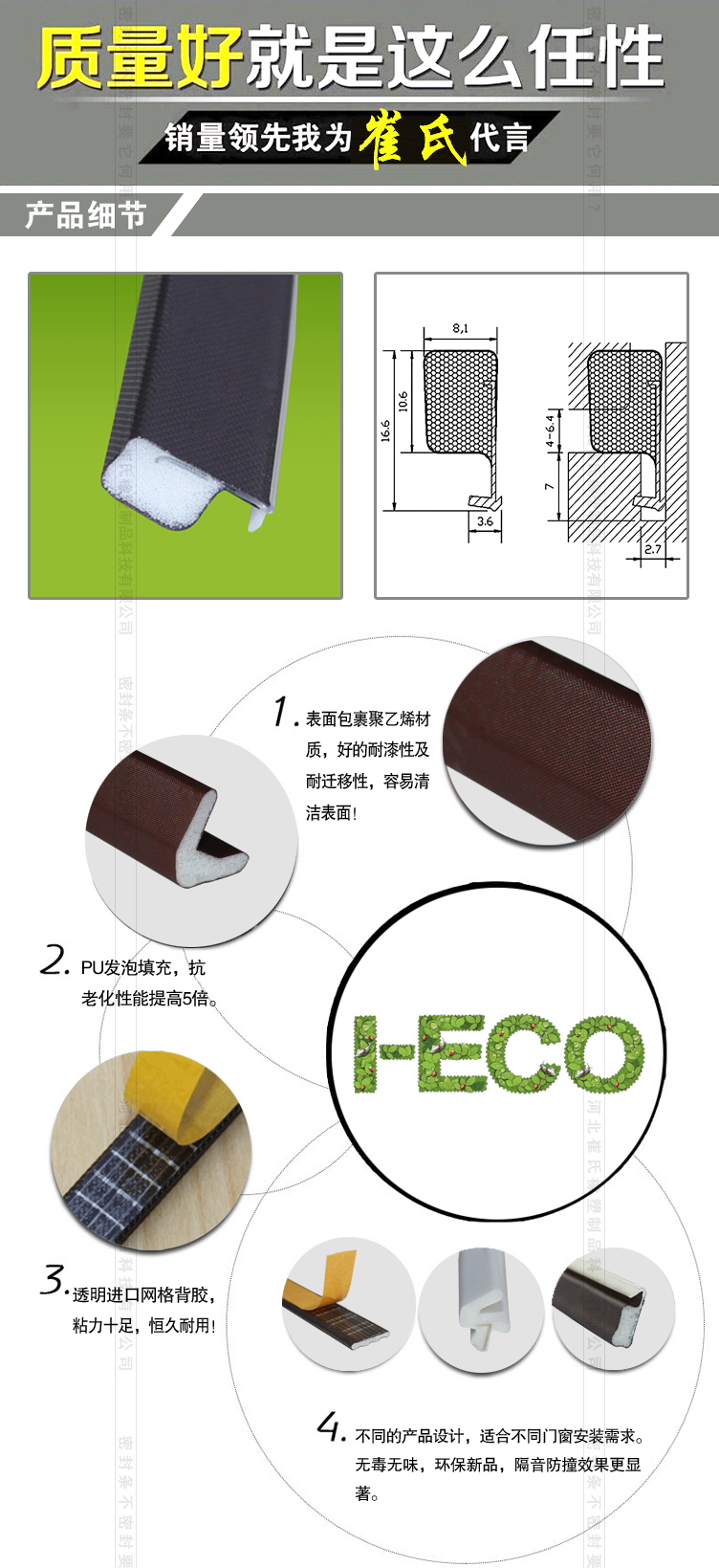 隔熱防寒,防風塵及爬蟲,外觀高檔,耐老化 防紫外線 防水不變形 產(chǎn)品質(zhì)保10年 深得國內(nèi)高端門窗廠家認可,是目前國內(nèi)最高端的新一代門窗密封條產(chǎn)品