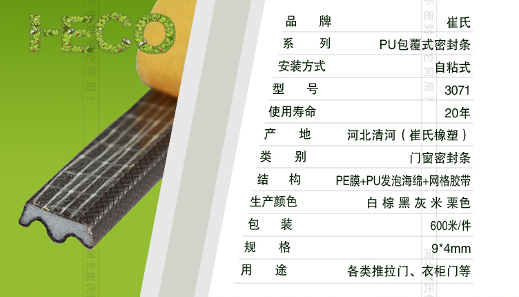 包覆式密封條,在防盜門、銅門、不銹鋼門的金屬門上的黏貼效果極佳,可適應(yīng)戶外四季溫度的變化,在操作安裝上不僅可節(jié)省30%的生產(chǎn)效率,同時(shí)更是便捷可行