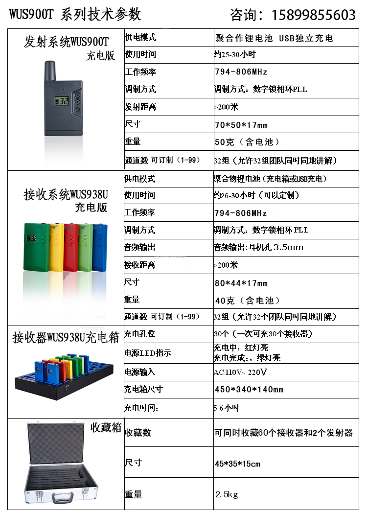 本系統(tǒng)是由一個腰掛式發(fā)射器和多個接收器及其附件構(gòu)成,性能穩(wěn)定可靠.wus900t是腰包式便攜發(fā)射器,同一場合能提供32-95-99組不同信道,可配合耳掛咪,領(lǐng)夾咪,頭戴咪使用,或連接其它音源.wus938是體積小巧便攜式的接收器,參觀者無需任操作便可聽到講解員的聲音,使用簡便舒適。