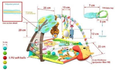 我司需要附件圖片款式的六邊形嬰兒運(yùn)動游戲墊: 尺寸80*80cm(最大直徑) 動物頭尺寸25cm寬度厚度6cm(pp棉填充) 地墊結(jié)構(gòu)上層滌綸布印花, 中間5mm厚epe, 底層滌綸布 兩個(gè)交叉活動掛架, 離地墊高度45cm 1側(cè)為樹干型網(wǎng)布帶圓洞, 樹干結(jié)構(gòu)中間3mm厚epe, 外面包覆滌綸印花樹干花紋面料; 4個(gè)tpr吊環(huán), 兩個(gè)玩具,1個(gè)牙膠,1個(gè)鏡子 5個(gè)pu發(fā)泡軟球 包裝: 每套裝1個(gè)彩盒 彩盒尺寸: 50*70*12cm; 請專業(yè)出口生產(chǎn)企業(yè)聯(lián)系我司確認(rèn)最低含稅寧波價(jià)格和訂單,我司企業(yè)qq